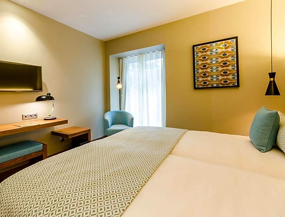The hotel’s elegant and modern double or twin rooms all come with a free WiFi and a flat-screen TV. The air-conditioned units also feature a private bathroom and most also have a small seating area.
