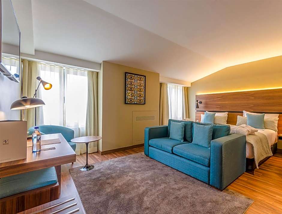 The hotel’s elegant and modern family rooms all come with a free WiFi and a flat-screen TV. The air-conditioned units also feature a private bathroom and most also have a small seating area.